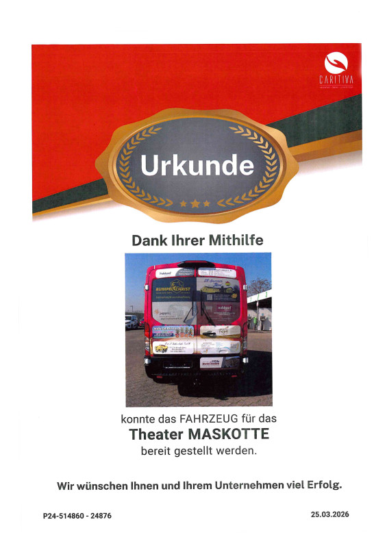 Im Rahmen unserer Unterstützung haben wir eine Werbefläche auf einem der Theaterfahrzeuge angemietet und begleiten so das Maskotte-Theater auf seinen Reisen durch die Region. Als Dankeschön haben wir nun eine Urkunde erhalten – eine schöne Geste, über die wir uns sehr freuen.